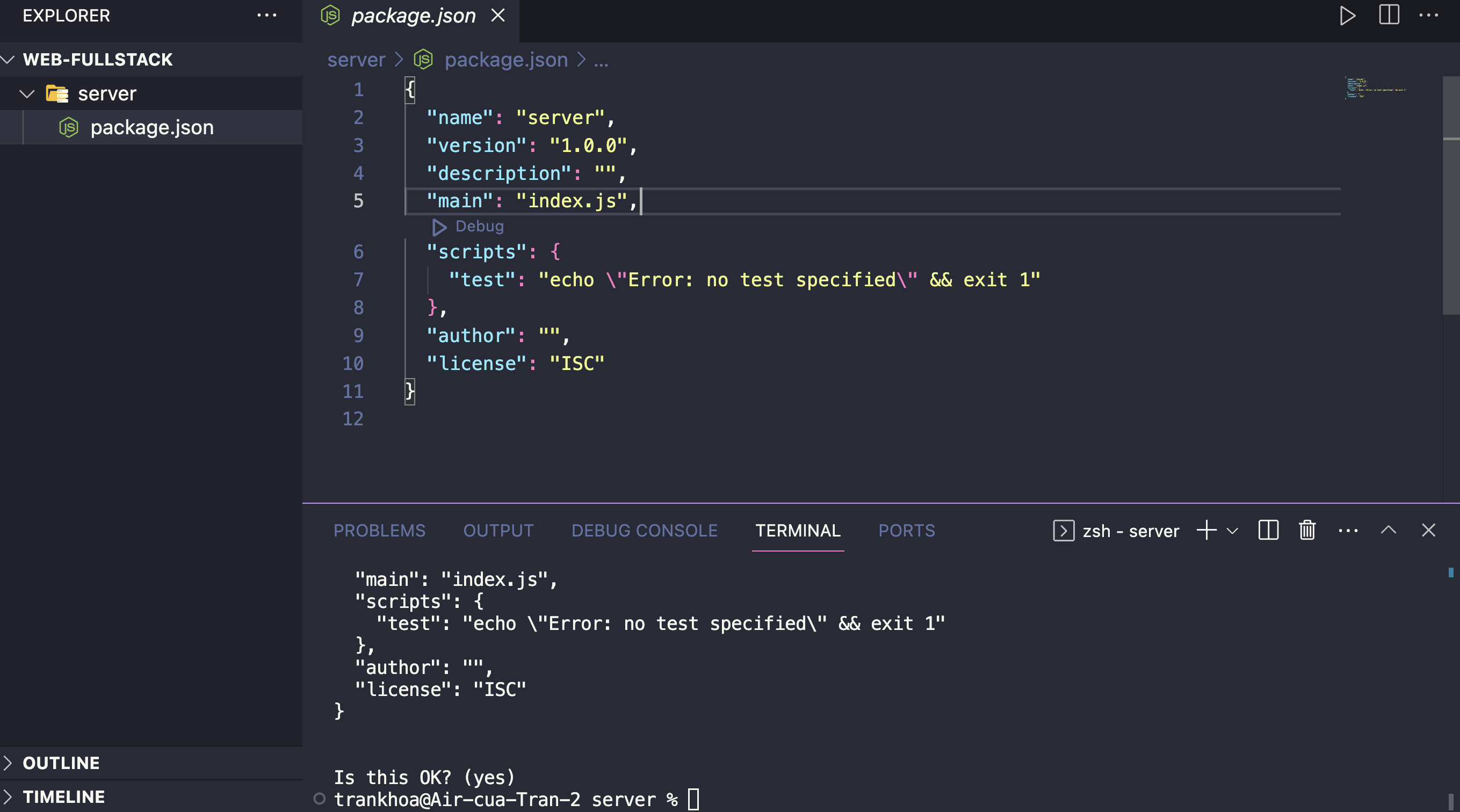 <figure><img src="https://content.gitbook.com/content/bApz6rKK01BWUpp5sM0n/blobs/2SLvR92KLLrdSS0ukU3V/image.png" alt=""><figcaption><p>Tạo file package.json</p></figcaption></figure>