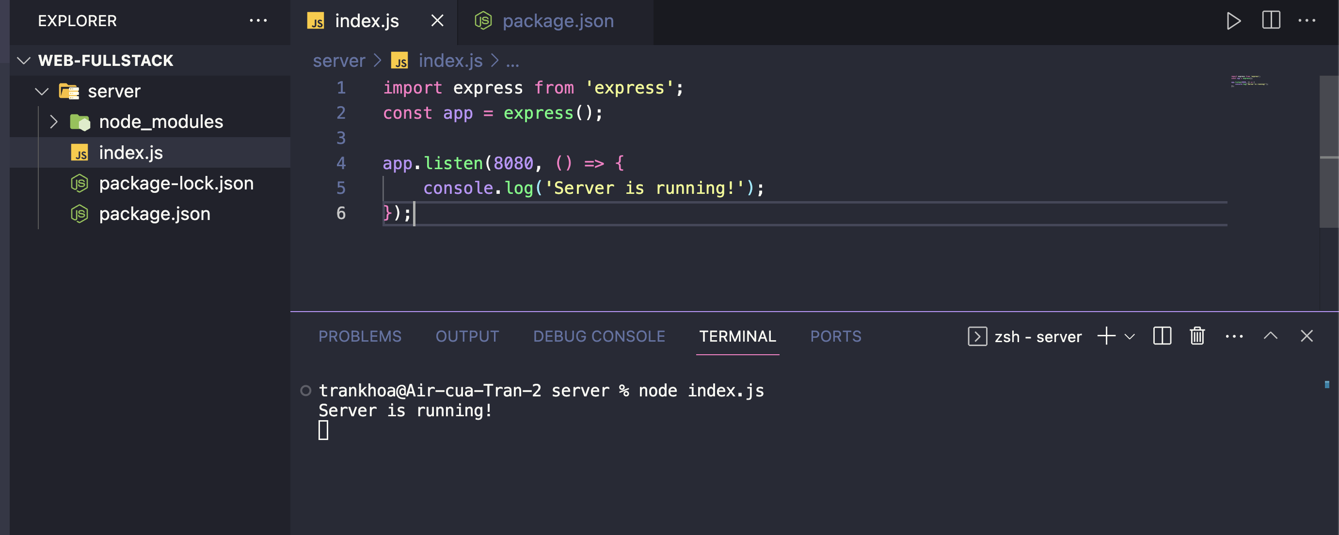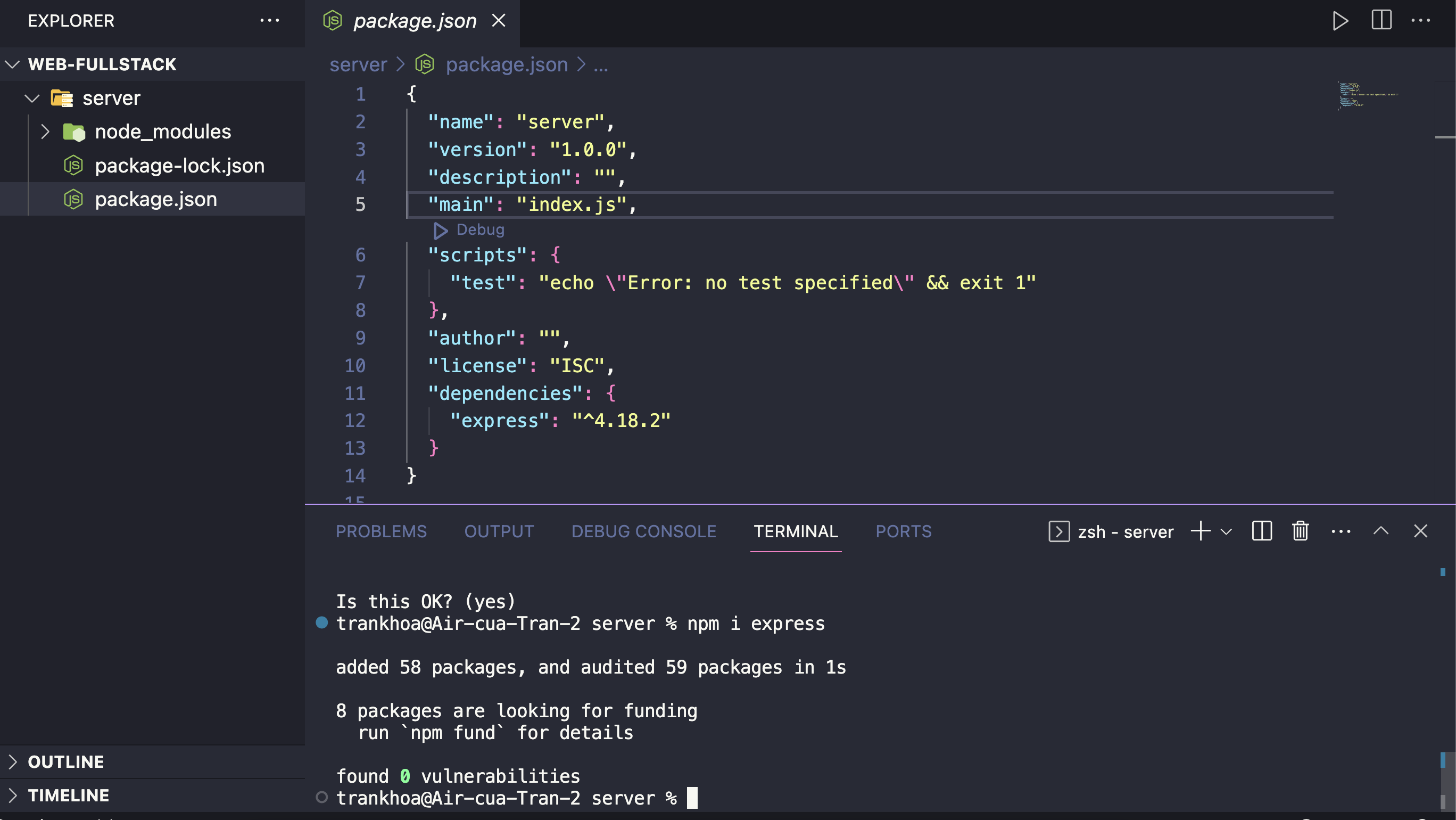 Ta có thể thấy file package.json có thêm một key là dependencies, với thông tin của express và phiên bản đã cài đặt.