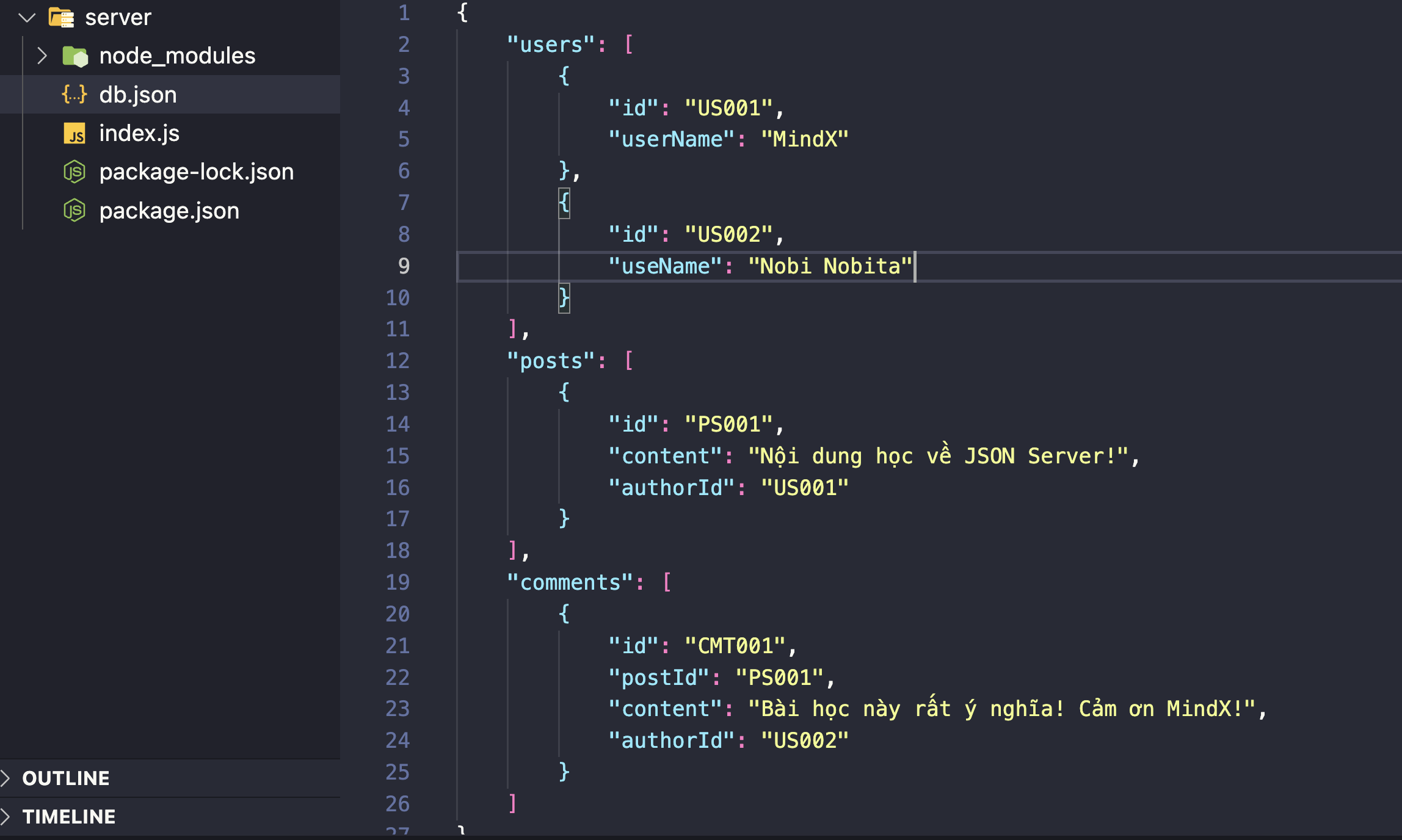Trong các bài học trước, dữ liệu được khởi tạo ngay trong file JS, sẽ bị reset khi restart lại server. Với json server, thư viện sẽ giúp chúng ta khởi tạo một server với RESTful API để tương tác, lưu trữ dữ liệu trên file json.