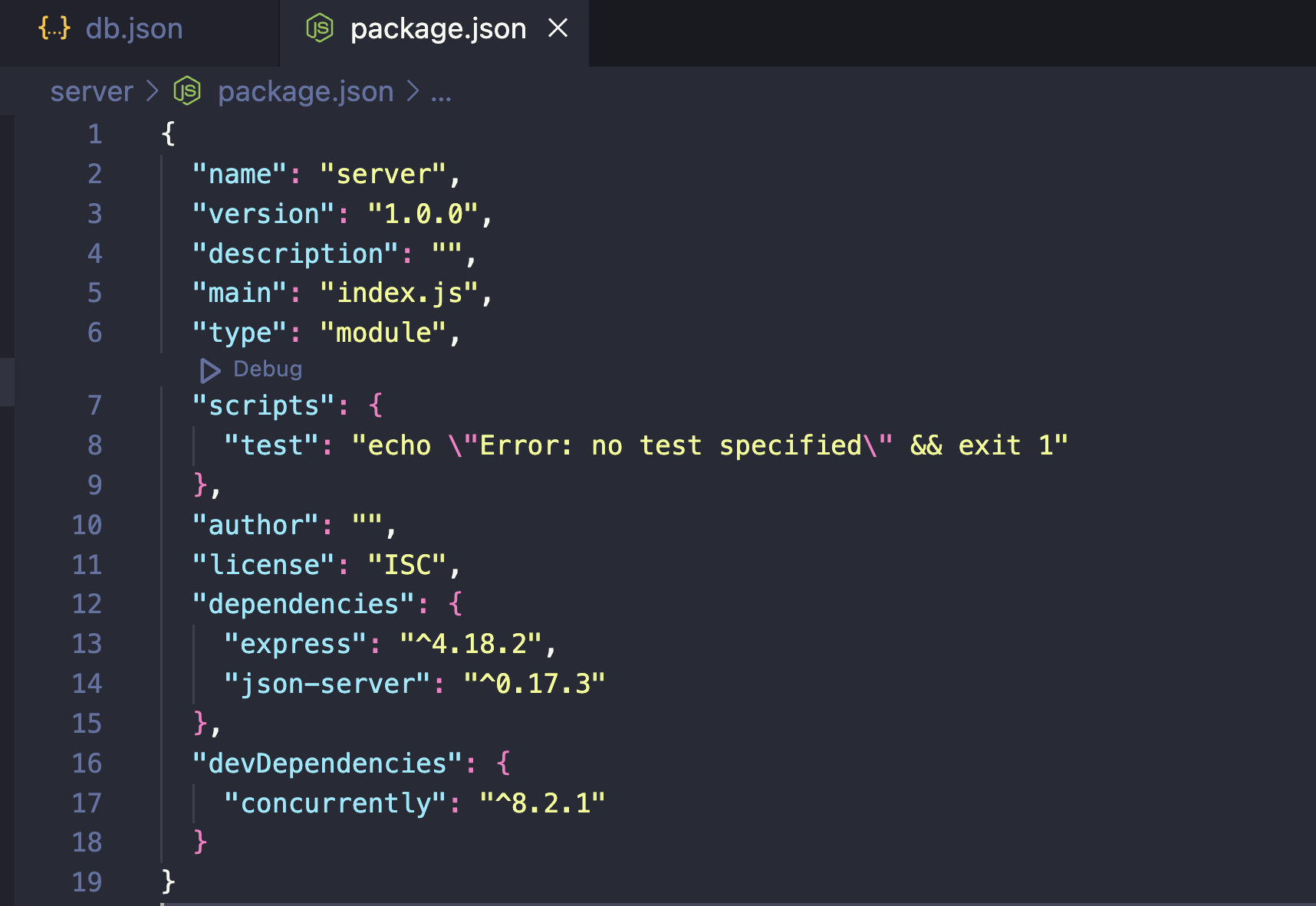 Ta cần phải có một file json để lưu trữ data, thực hiện tạo một file db.json để lưu trữ các resource như sau: