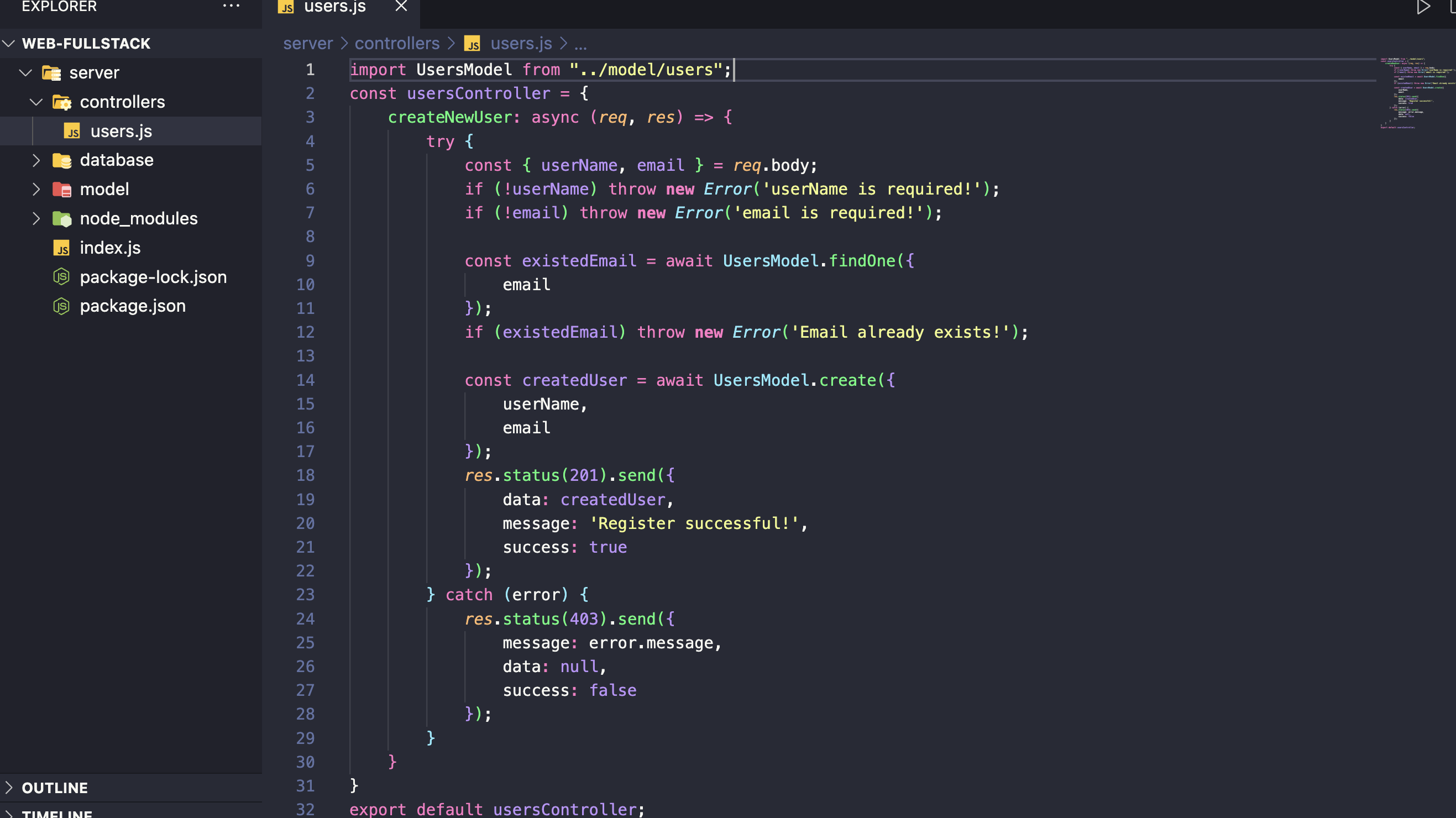Tạo folder `controllers`, file `users.js` (có thể là users.controller.js, ...tuỳ thuộc vào rule được sử dụng trong dự án)